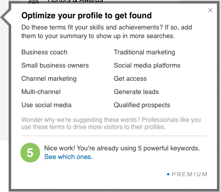 Optimize that profile. It’s not as difficult as you may think. LinkedIn’s going to help you a bit more. They are suggesting what keywords may help you stand out and be found in search. Remember your profile Summary is a way to attract others to learn more about you.