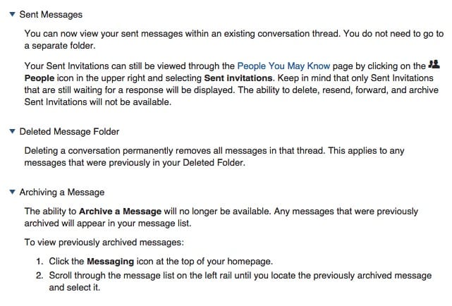 To get an idea of these LinkedIn inbox changes, use this link to learn more: Updated Messaging Features. Unfortunately, this link is not easy to find in LinkedIn’s Help Center. I searched ten ways from Sunday to find this information and even put in the exact title of the update and got nothing. So, use the link in this post to learn more. Also unfortunate, but not new, LinkedIn does not provide screen shots in their Help Center, so I hope all of the images below in this post will put some context around the new look.