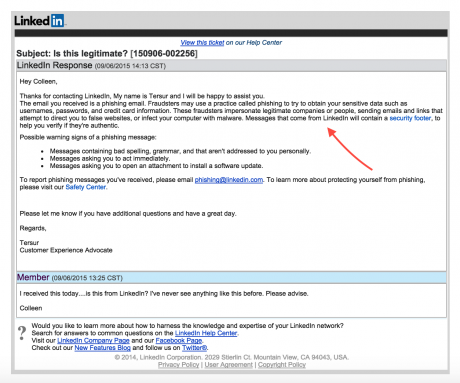 A couple of hours later I had a response from LinkedIn both in my Gmail and in my Support History within LinkedIn’s Help Center. For your own protection, please note what LinkedIn says in their response.