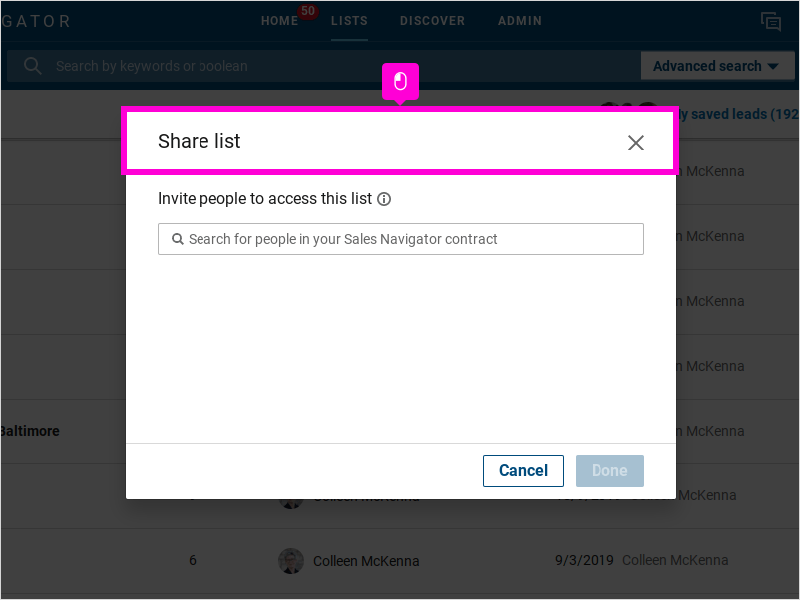 4 A pop-up window will appear for you to share the list with Sales Navigator users in your company.