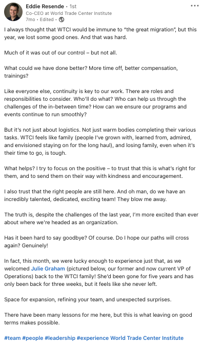 A few months back, Eddie Resende, Co-CEO of the World Trade Center Insitute, and I spoke on the phone, discussing his desire to do more on LinkedIn and learn more best practices. We discussed the feedback he received on a recent post he created.